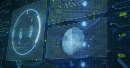Futuristic head up display showing rotating scan indicator and data analysis charts