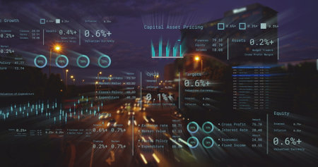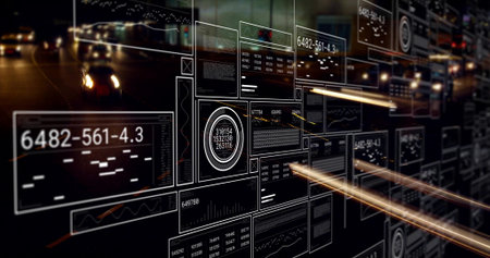 Displaying digital panels on night highway with readouts and gauges, light trails and headlights. Futuristic, technology, data visualization, nightscape, interface, motion, analytics