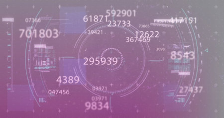 Numerous digital numbers and graphics floating on purple background. They are creating a futuristic technological interface