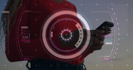 Image of data processing and scope scanning over biracial woman using smartphone. Global business, technology and digital interface concept digitally generated image.