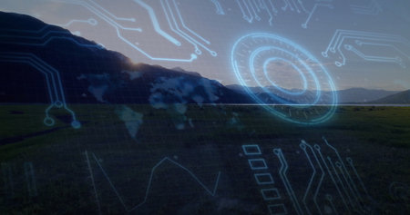 Displaying mountain ridge spanning valley at dusk, with blue circuit patterns, copy space. Nature, technology, landscape, futurism, innovation, connectivity, outdoor