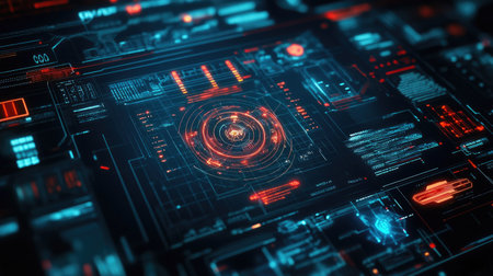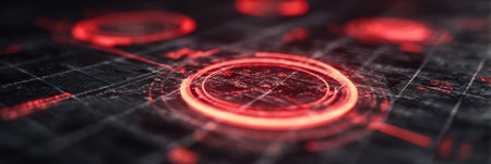 Stunning digital interface with a dark background and vivid red highlights, showcasing data visualization and modern technology elements, perfect for futuristic projects.