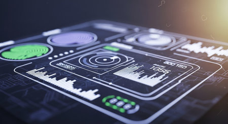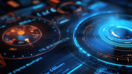 High-tech interface close-up showcasing glowing circular elements, buttons, and displays.