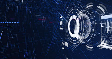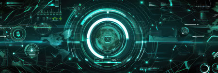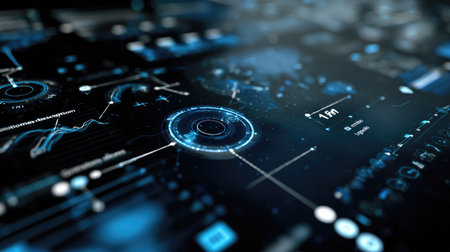 This image showcases a futuristic digital interface with numerous data elements and informational displays. The composition is characterized by a dark background with vibrant, glowing elements and lines. The image employs a modern, technical style suitable for various design, technology, or informational applications.