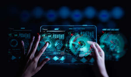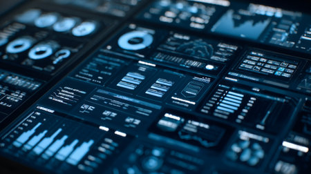 Intricate digital interface featuring bright screens with various graphs, charts, and data visualizations set against a dark background