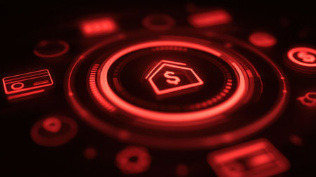 This striking red digital interface showcases financial symbols and currency icons, representing modern technology in finance and investment analysis.