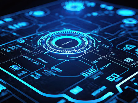 A captivating futuristic digital dashboard showcasing glowing interfaces and high-tech elements ideal for themes of data analysis, cybersecurity, and technological advancements.