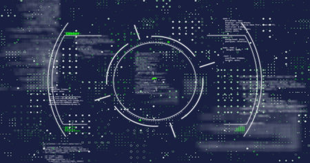 Image of scope scanning over data processing on black background. Global technology, computing, connections and digital interface concept digitally generated image.
