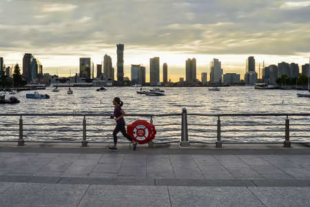 New York City, USA - June 8, 2017: Unidentified woman running by west street with the Jersey city skyline in the background at sunset
