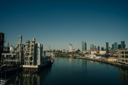 Dock with industrial factories and warehouses on the East River in New York City, USA