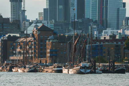 Boats moored at Thames riverbank with modern skyscrapers in background