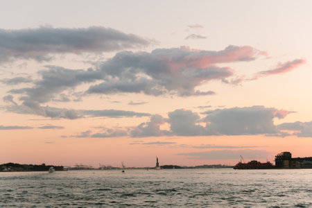 The Statue of Liberty stands tall as the sun sets, painting the sky with vibrant hues over the New York Harbor.