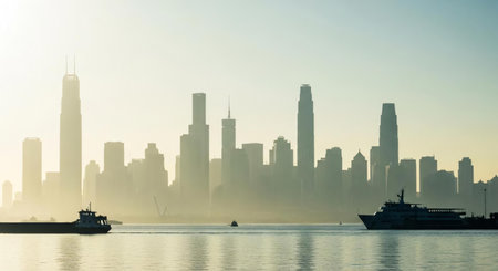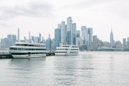 Skyscrapers dominate the cityscape. Boats rest along the New York pier. Urban river views define Manhattan. New York City skyline rises at dusk. Yachts float near waterfront. NYC travel iconic scene.