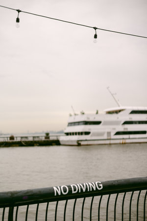 A luxurious yacht is anchored at the dock beside a sign advising against diving, under gray skies.