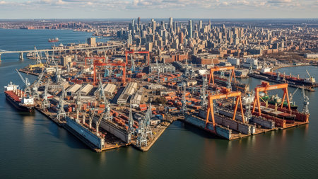 Aerial view of brooklyn navy yard in new york city with skyline.