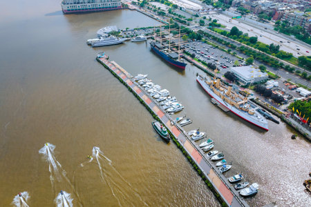 Aerial view by drone of yacht of marina a dock basin small boat in a over East River at New York City USA
