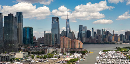 Aerial Photo of Manhattan Island with Office and Apartment Buildings. Hudson River Scenery with Yachts, Boats, One World Trade Center Skyscraper in the Middle of Skyline