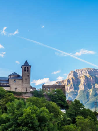 Torla Ordesa, church with the mountains at bottom, Pyrinees Spain vertical.