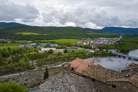 Unknown location - May 6, 2024: Elevated view showing the tiled rooftops of historic buildings in Ainsa-Sobrarbe, with the Cinca River, a bridge, modern town structures, green fields, and forested hills under a cloudy sky.