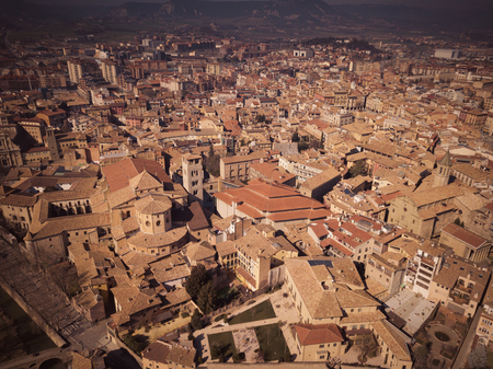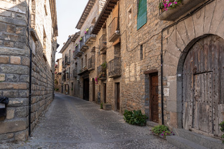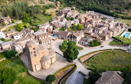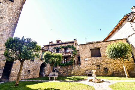 Shot of historical settlement of Anso and its surroundings, medieval urban Gothic buildings