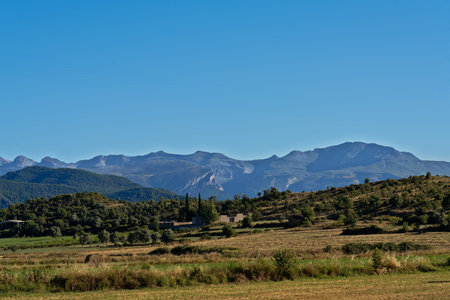 Dreamy Pyrenees mountains landscape at summertime in ‎â¨Caldearenasâ©, â¨Huescaâ©, â¨Spainâ©. View from Mudejar highway, Puerto de Monrepos