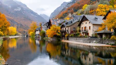 Traditional houses line the Gave d'Aspe river reflecting the colorful autumn foliage in Accous, French Pyrenees