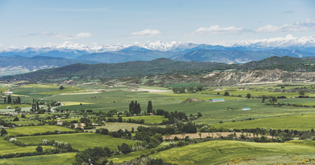 View from viewpoint Santa Cruz de la Seros, Huesca, Spain. The mountains in the background and the blue sky with clouds.
