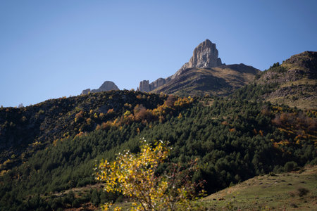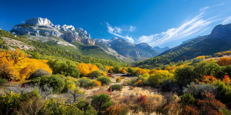 Vibrant Autumn Colors Adorning a Verdant Mountain Landscape under a Clear Sky. Concept Mountain Landscapes, Autumn Colors, Clear Skies, Vibrant Scenery, Nature Photography