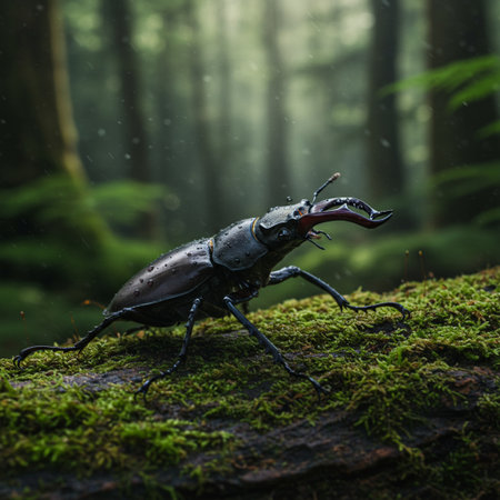 This captivating image features a dark beetle in a fog-laden forest, showcasing intricate details and an eerie atmosphere. Ideal for themes of nature and mystery.