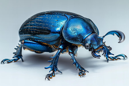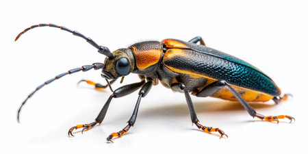 the beetle, showcased against a pristine white background, stands out with its intricate features and vibrant colors, creating a striking contrast that exudes simplicity and elegance, perfect for nature enthusiasts and entomology fans fascinated by insect photography and macro wildlife images. ai generated