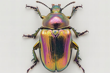 Metallic beetle with iridescent shell on white background, macro lens, soft studio lighting, scientific specimen style