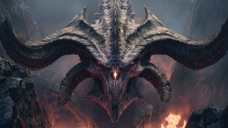 3D illustration of a demon with horns and a fire in the background