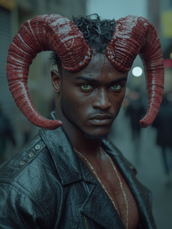 Intense portrait of a man with striking devil horns.