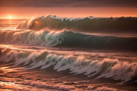 A massive, curling ocean wave crashes under a golden sunset, showing the raw power and breathtaking beauty of natures marine forces at the coast. Water droplets and light interplay highlight the scene. AI generated image