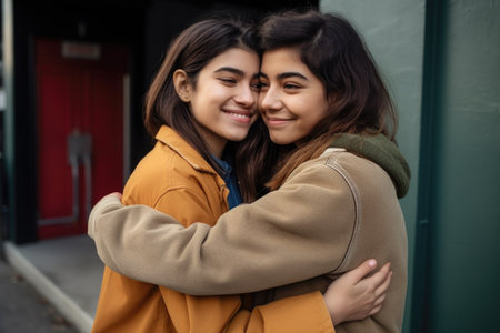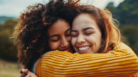 Two women embracing each other warmly in an outdoor setting.. Generative AI