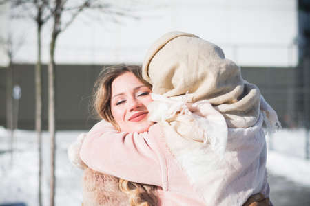 Two girls hugging on a busy city street. anticipation of separation, meeting after a long separation
