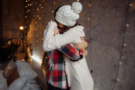 Stylish happy couple hugging each other and spending christmas eve together. Joyful cozy moments in winter holidays. Seasonal greetings. Advertising concept