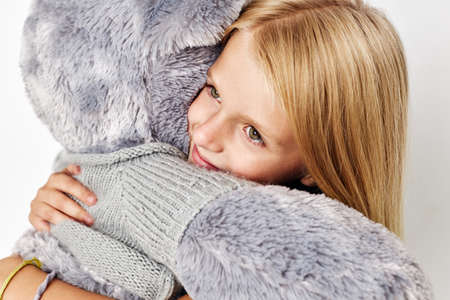 Little girl holding her rabbit toy close up on gray background.