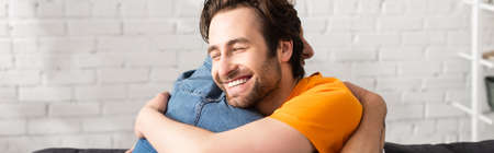 Man smiling and hugging mature father, banner