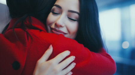 A heartwarming hug between two women at an airport.. Generative AI