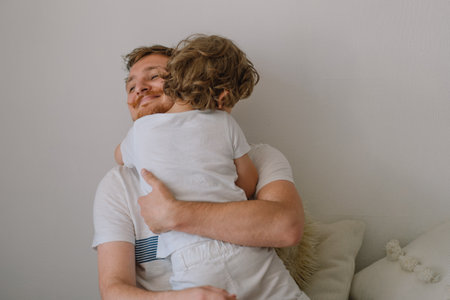 Loving gay couple sitting on bed and hugging, embracing each other. LGBT community, equal rights, beauty and love.