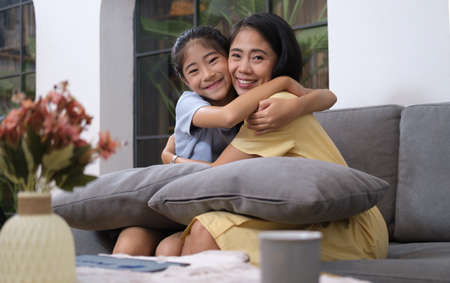 Beautiful young woman and her adorable little daughter are hugging and smiling to camera. People and family concept.