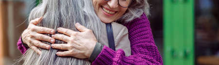 Smiling mature woman embraces female friend meeting on modern city street