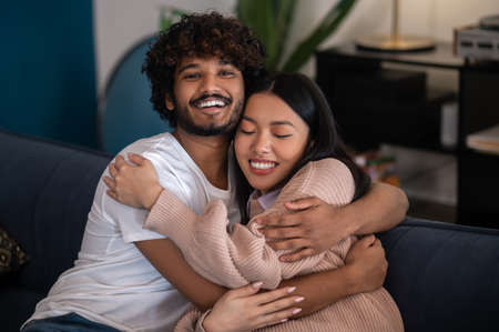 Handsome idnian guy hugging his asian girlfriend and both looking happy