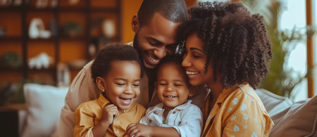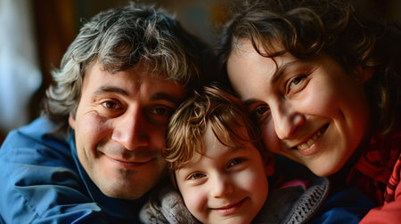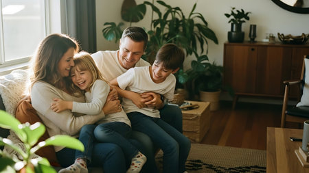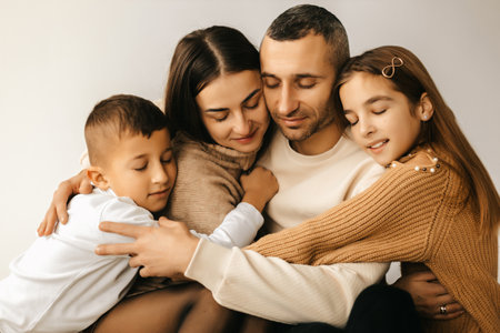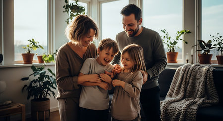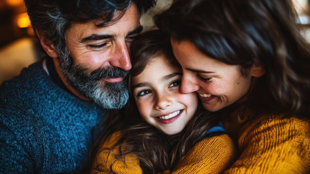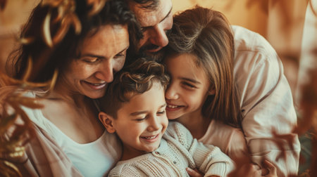 Affectionate family hugging and smiling together indoors with warm tones. Concept of family bonding and love