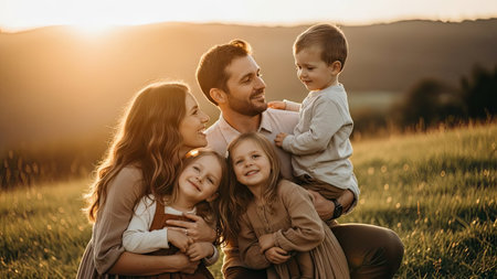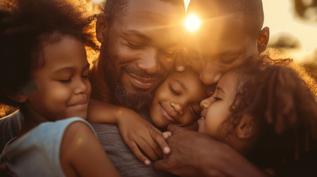 A family of four is embracing each other, radiating warmth and affection. The scene is bathed in golden sunlight during the sunset. The image displays a soft focus with warm colors and a shallow depth of field, suggesting a peaceful outdoor setting. This photograph could be used for various commercial or editorial purposes.