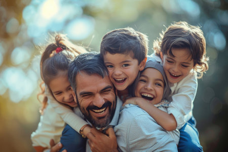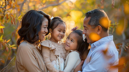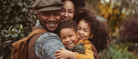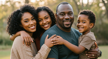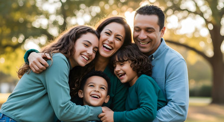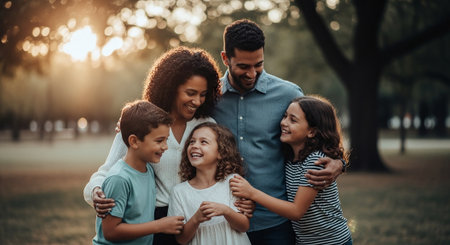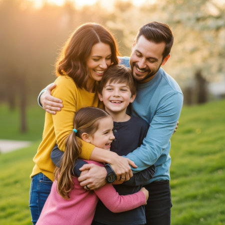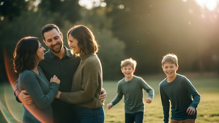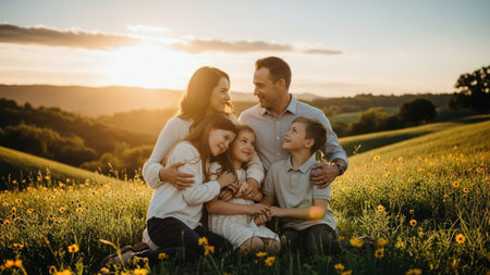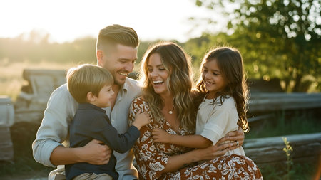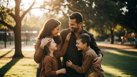 A heartwarming image of a family of four enjoying a sunny day in the park. The parents are embracing their two children, who are smiling and laughing. The family appears to be having a wonderful time together, surrounded by lush greenery and a warm, golden sunset.