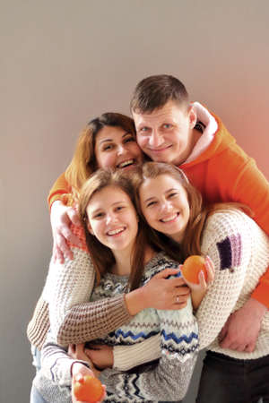Happy family having fun at home. Mother, father and their children are hugging and smiling.