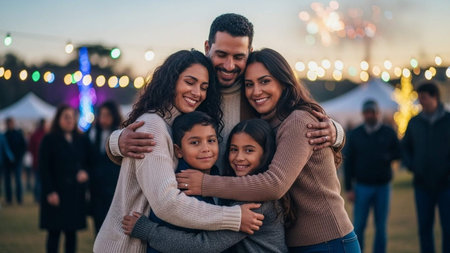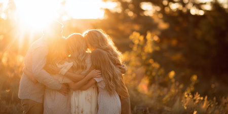 A family of five is depicted in a warm, outdoor setting, possibly during the golden hour. The image displays a family embracing each other with a soft, natural color palette. The composition uses natural light and a shallow depth of field, emphasizing the emotional connection. It is suitable for family-related content or lifestyle illustrations.