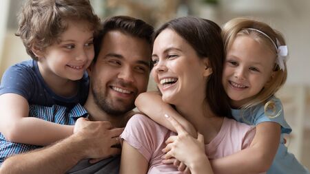 Head shot close up family portrait positive parents hugging little son and daughter, feeling joyful. Happy young married couple having fun, joking, laughing with cute school children at living room.